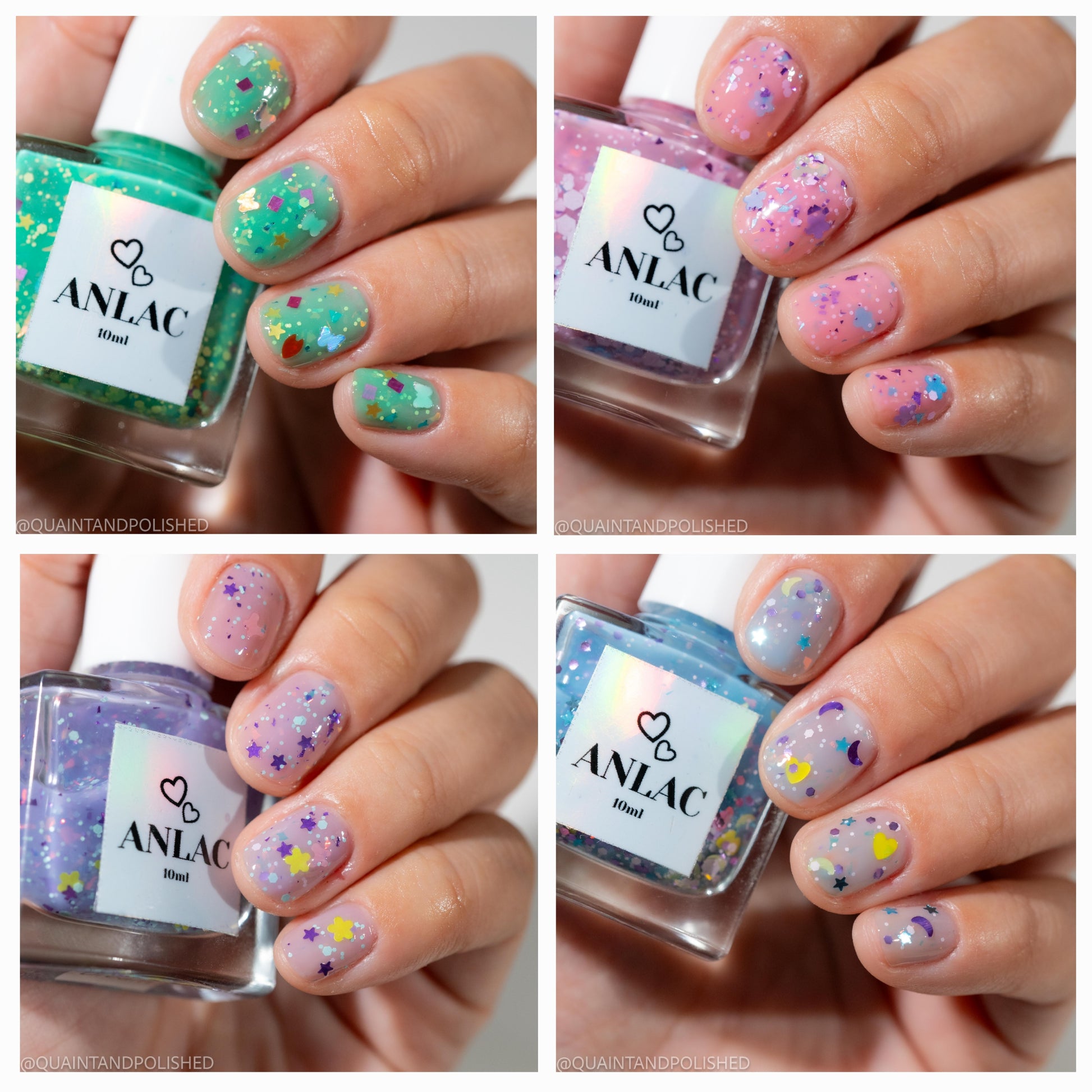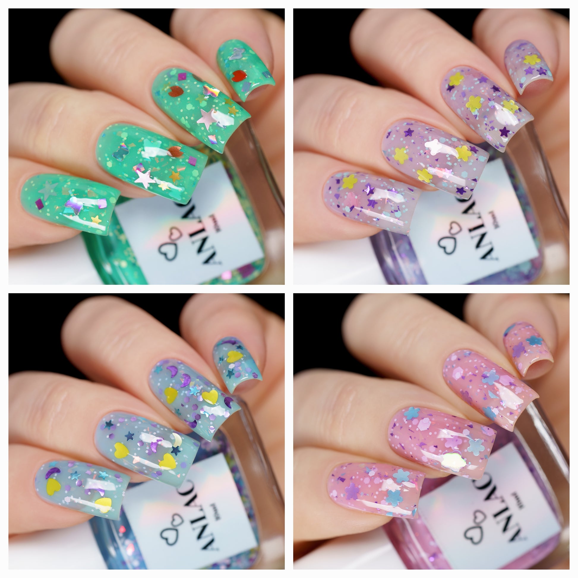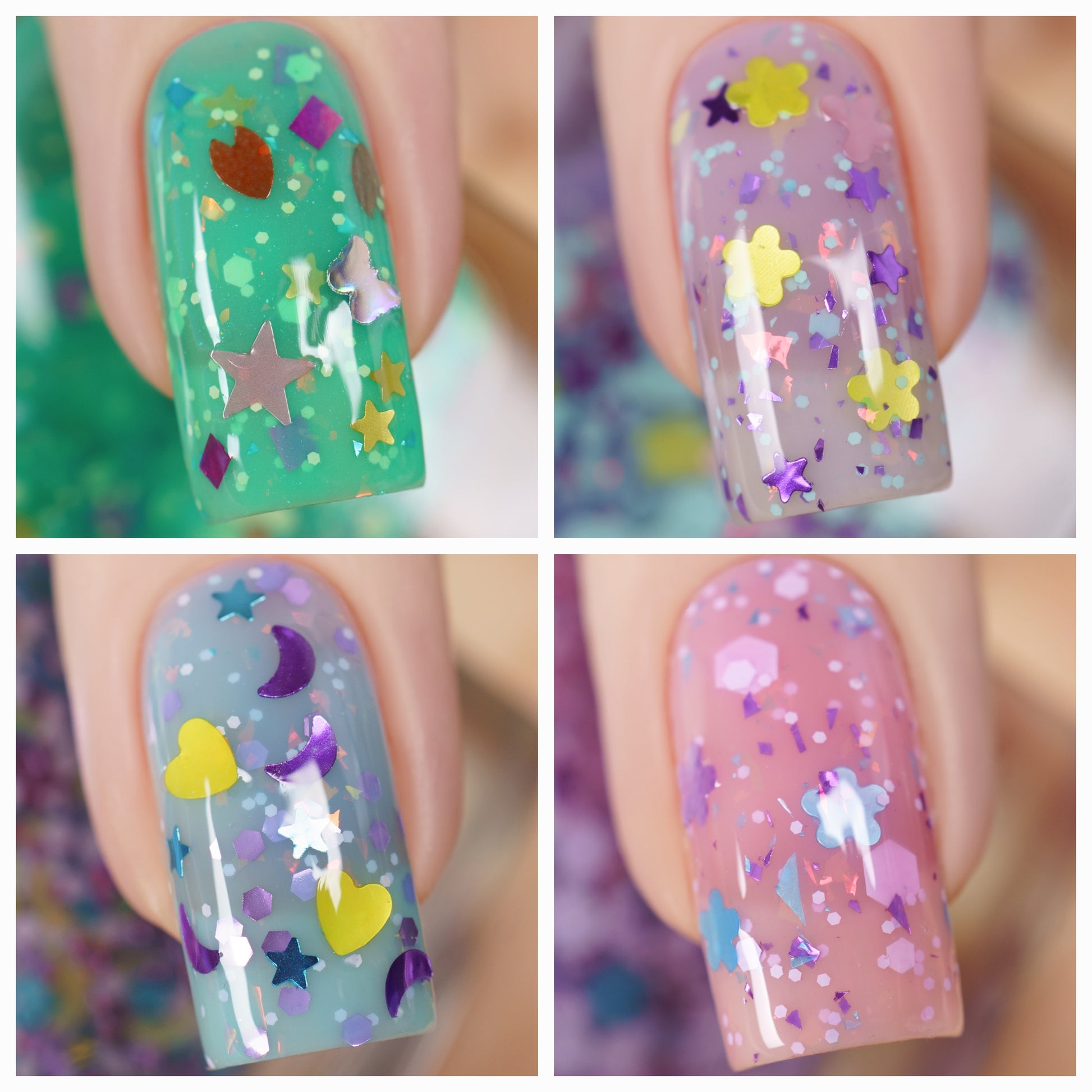 Each polish comes with a small bag of larger glitters to make application easier, so you don’t have to fish for specific shapes in the bottle.