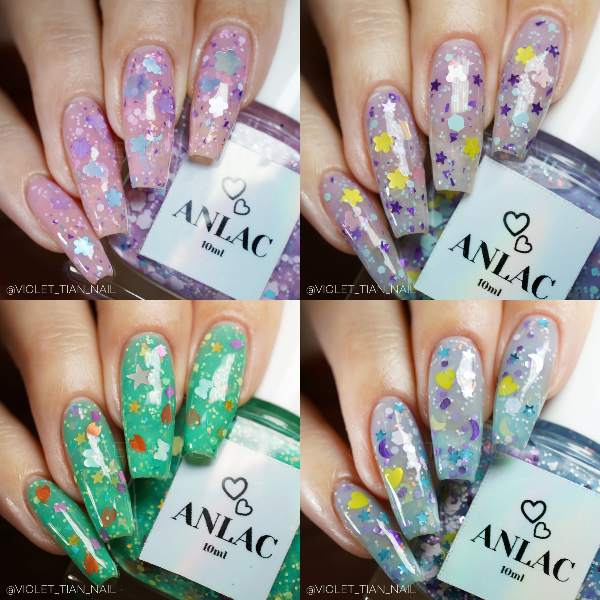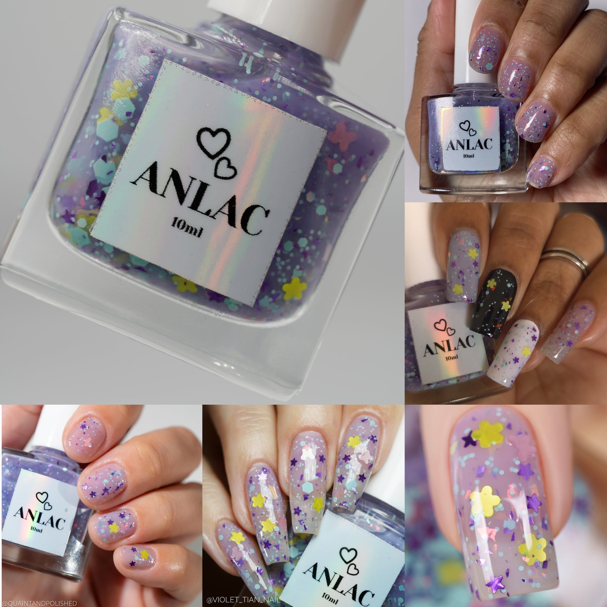 StarPop Dream - jelly lilac base with various light blue hex glitter, red-gold flakes, purple flakes, purple star glitter, neon yellow flower glitter and pink butterfly glitter.