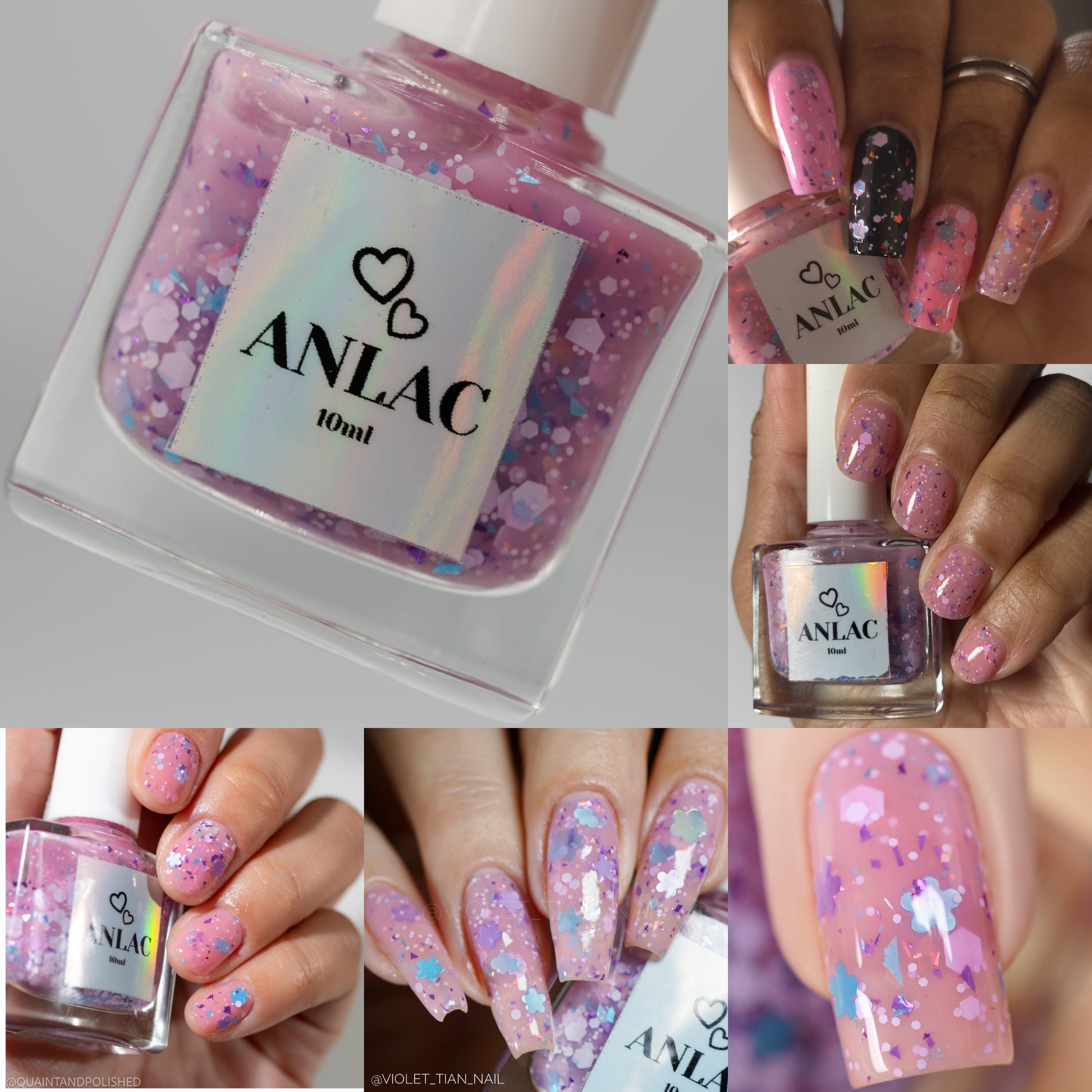 CloudPop Dream - jelly pink base with various lavender hex glitter, purple flakes, light blue flakes, red-gold flakes, light blue flower glitter, lilac flower glitter and light blue cloud shape glitter.