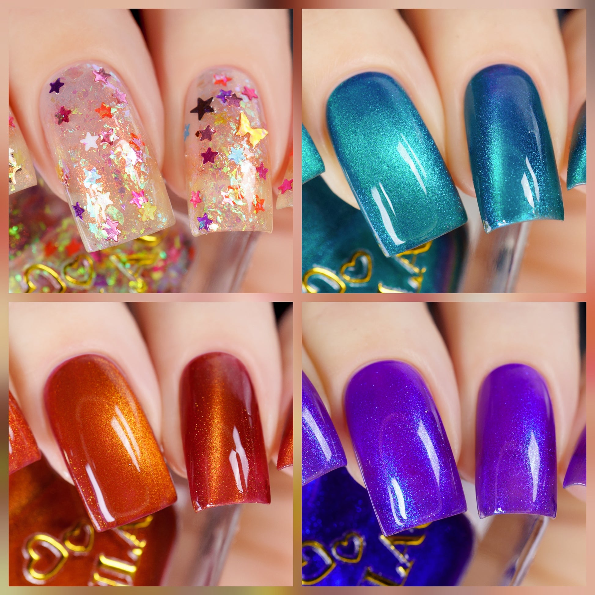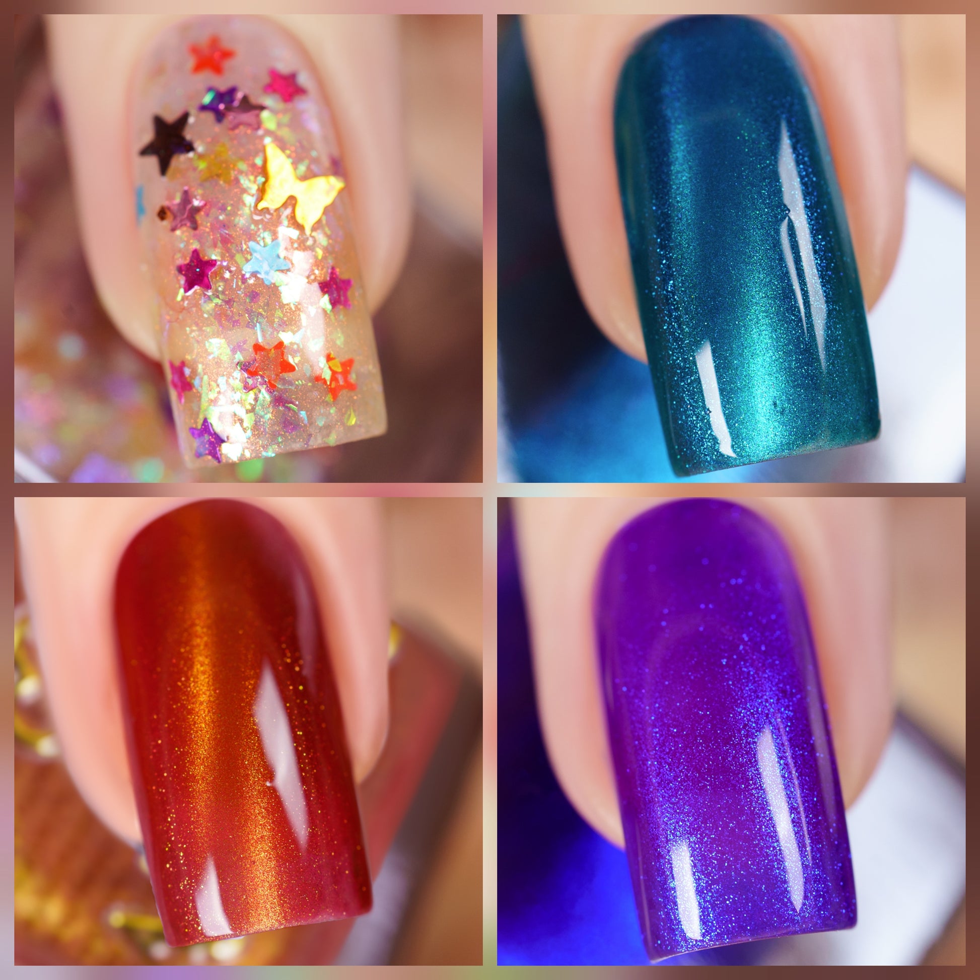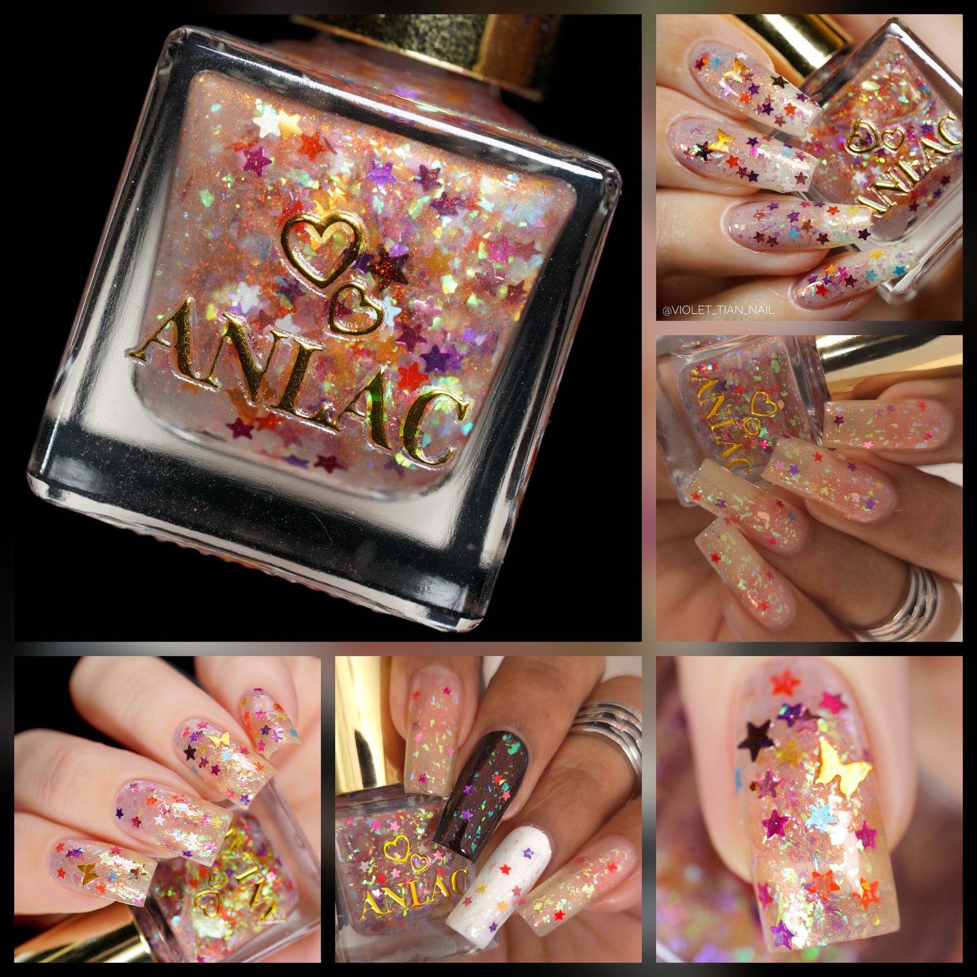 - Fireworks - It's a transparent base one with various colors of star glitters, holo gold butterfly glitter, green-blue-purple flakes and red-orange shimmer.