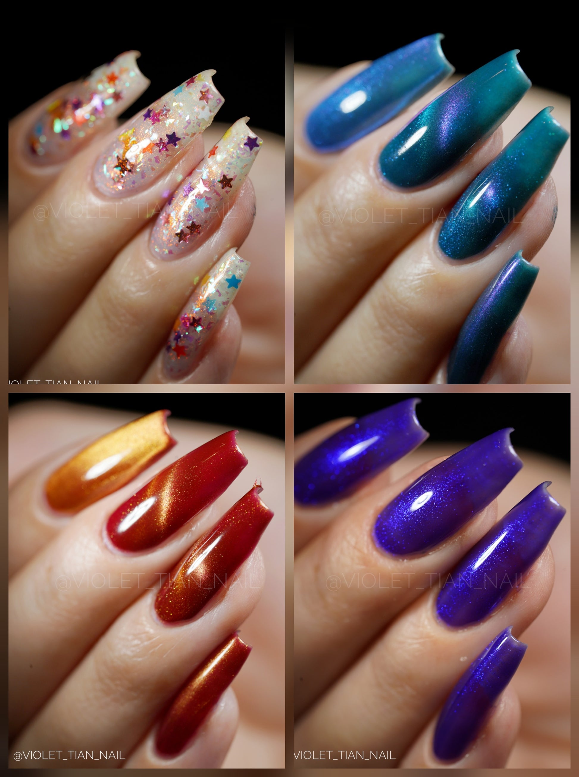 Fireworks - It's a transparent base one with various colors of star glitters, holo gold butterfly glitter, green-blue-purple flakes and red-orange shimmer.