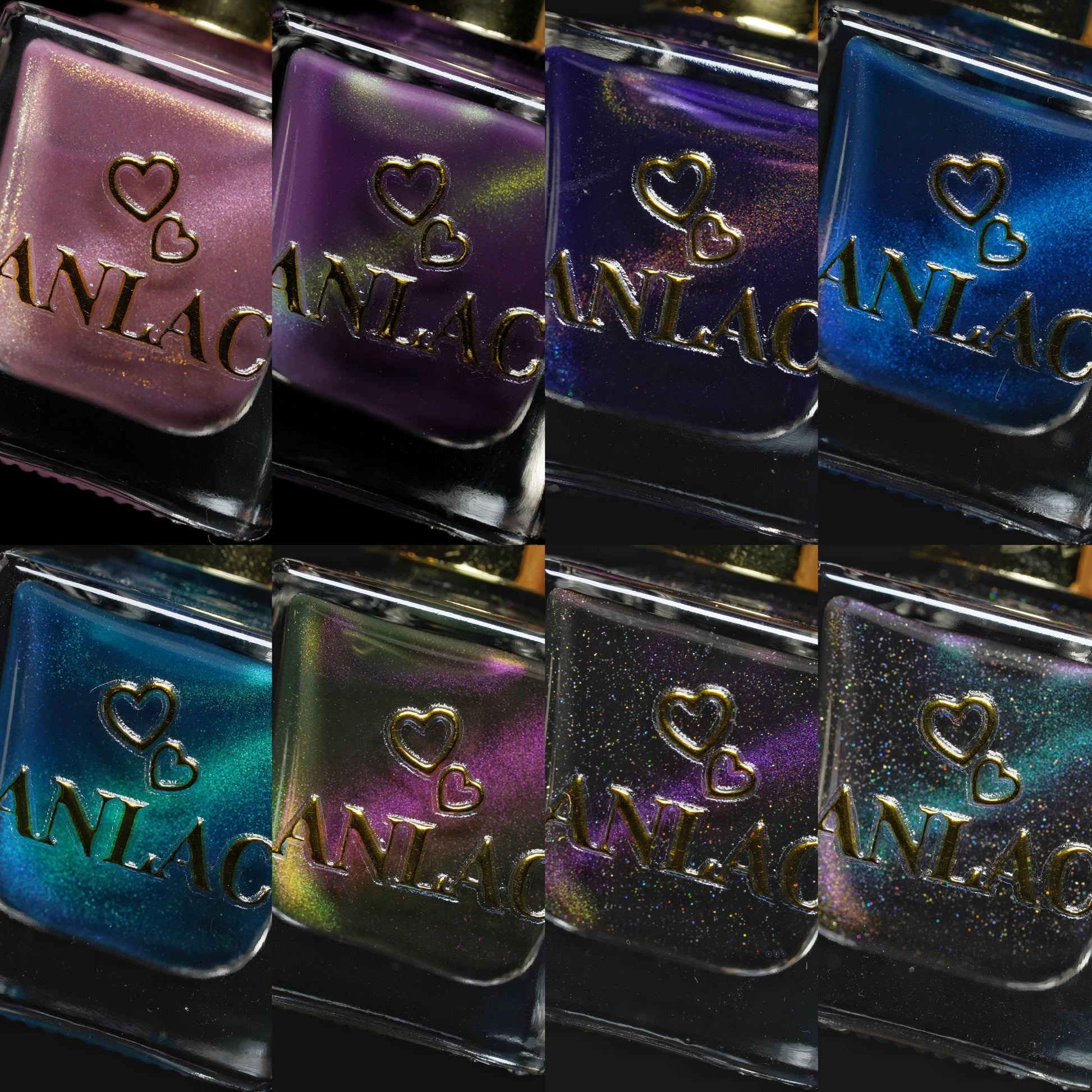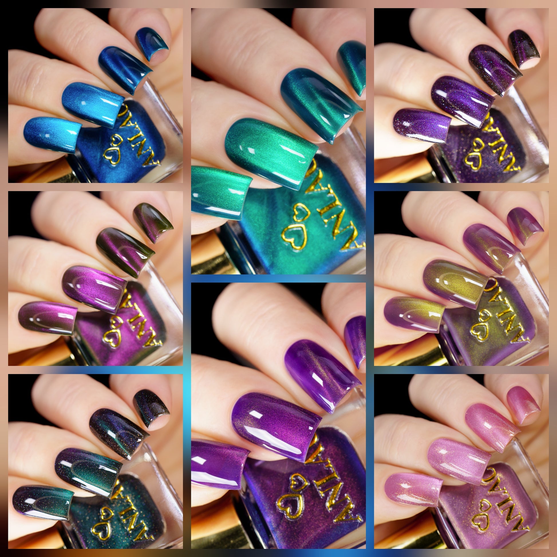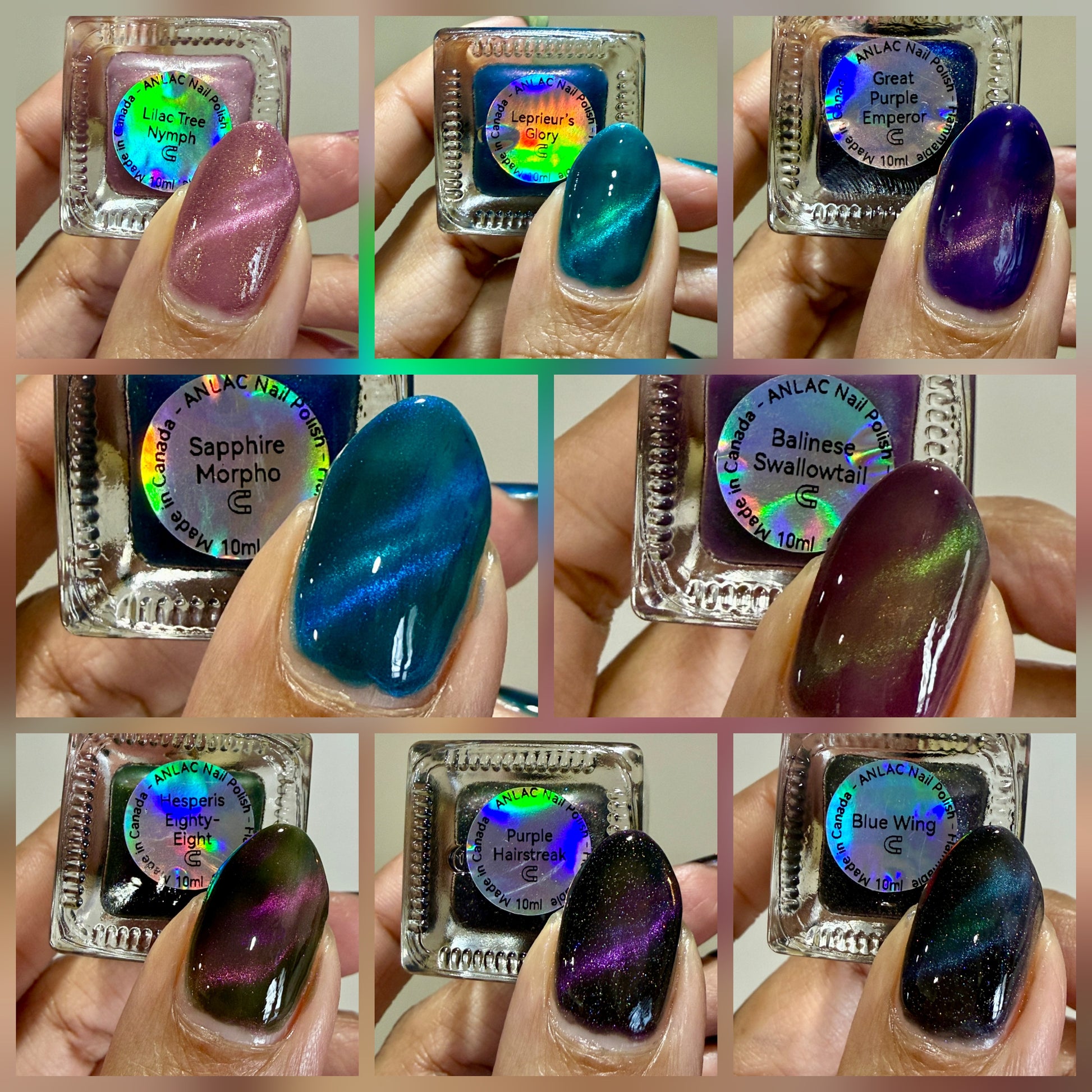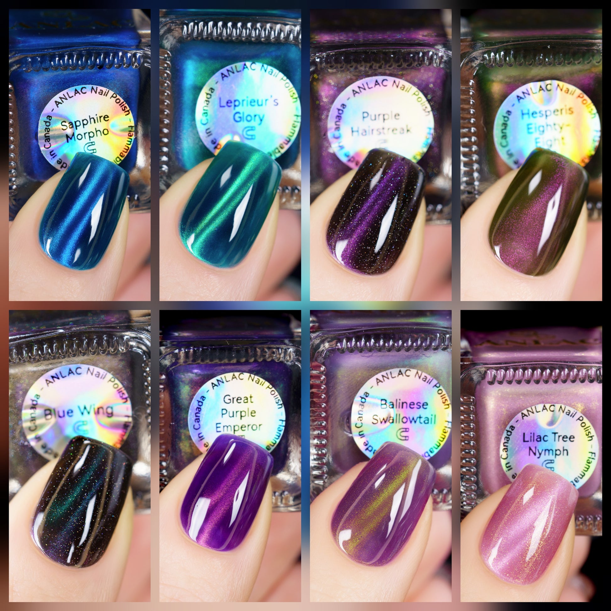 Blue Wing (magnetic): Black base with holo shimmer and cyan-purple-green fine-particle magnetic shimmer