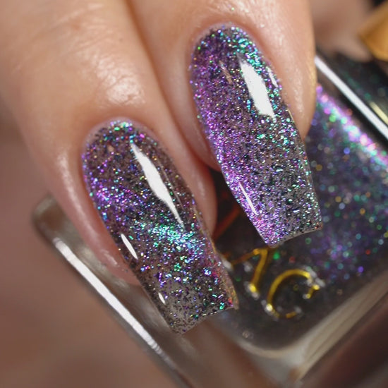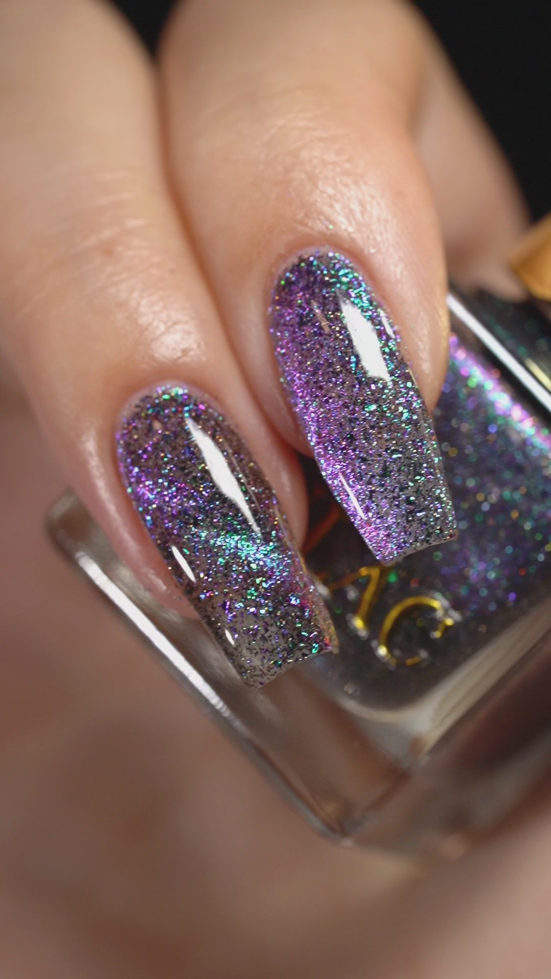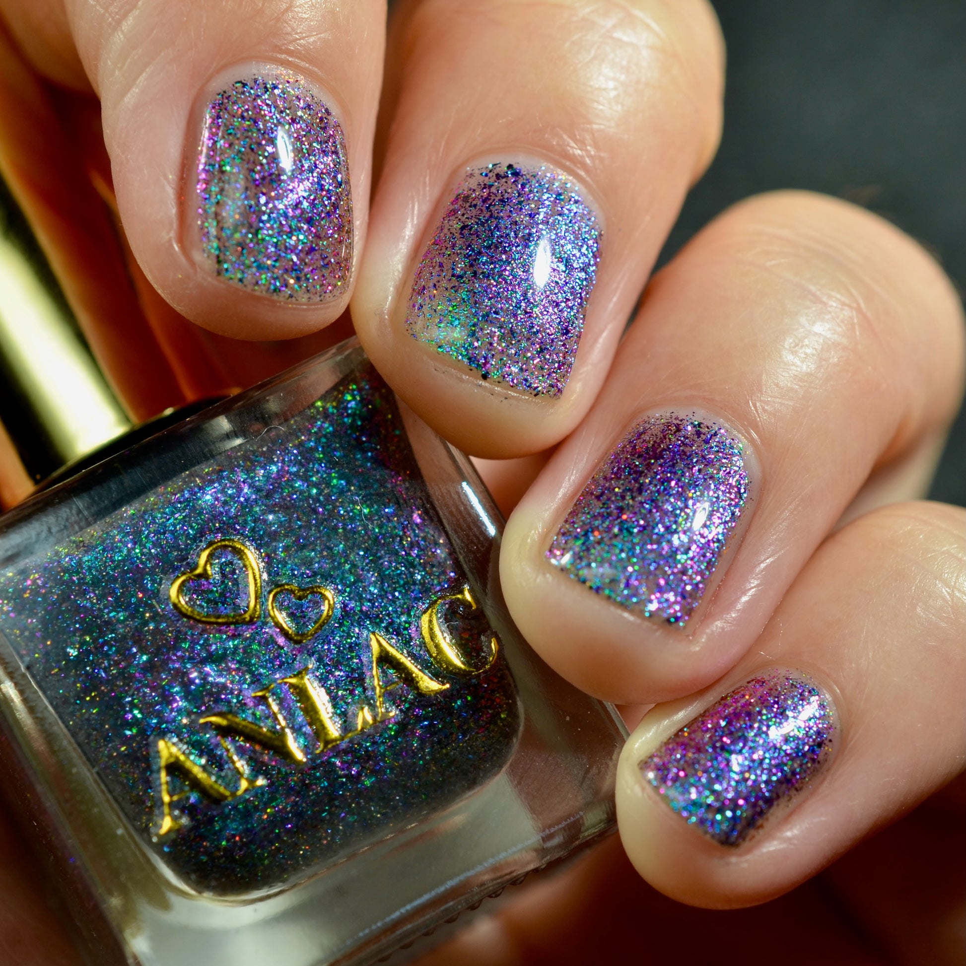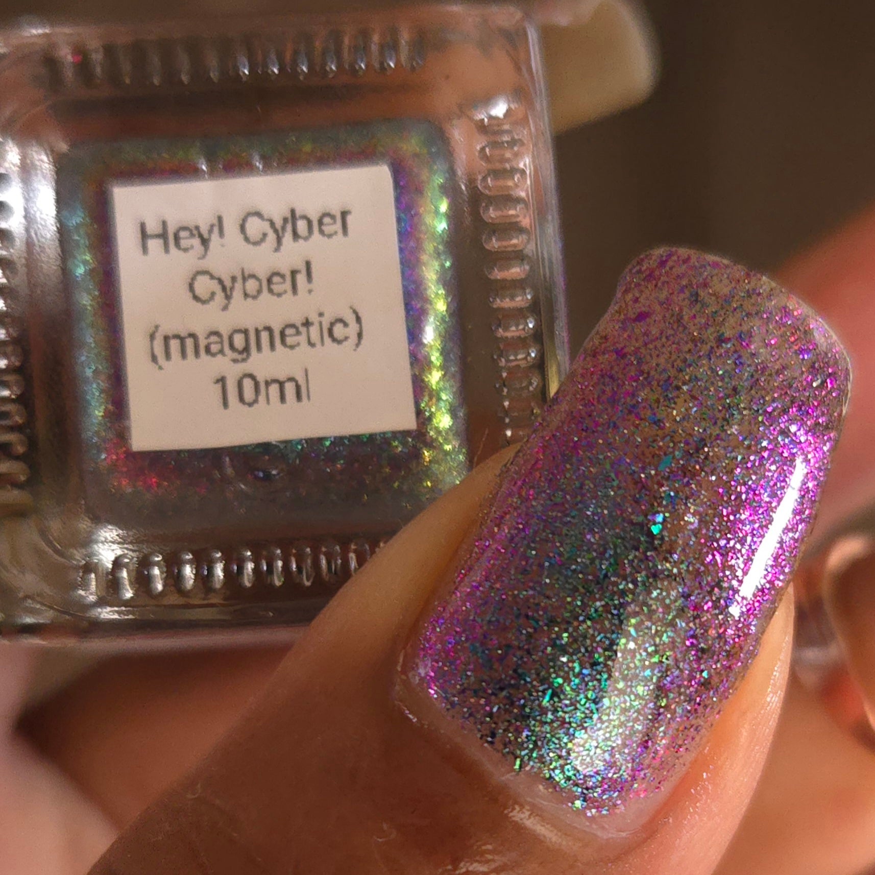 Hey! Cyber Cyber! (magnetic) β A transparent base with holographic shimmer, cyan-blue-purple flakes, and matching magnetic shimmer.