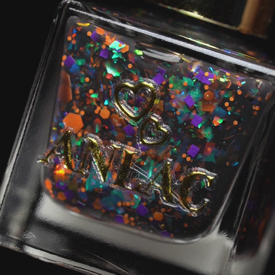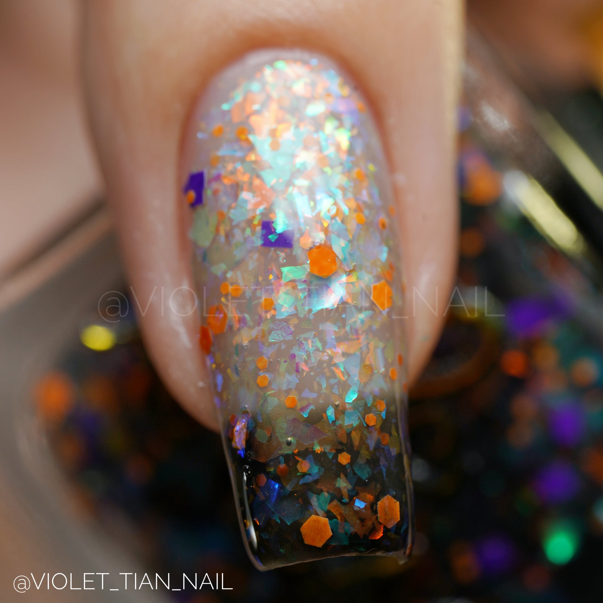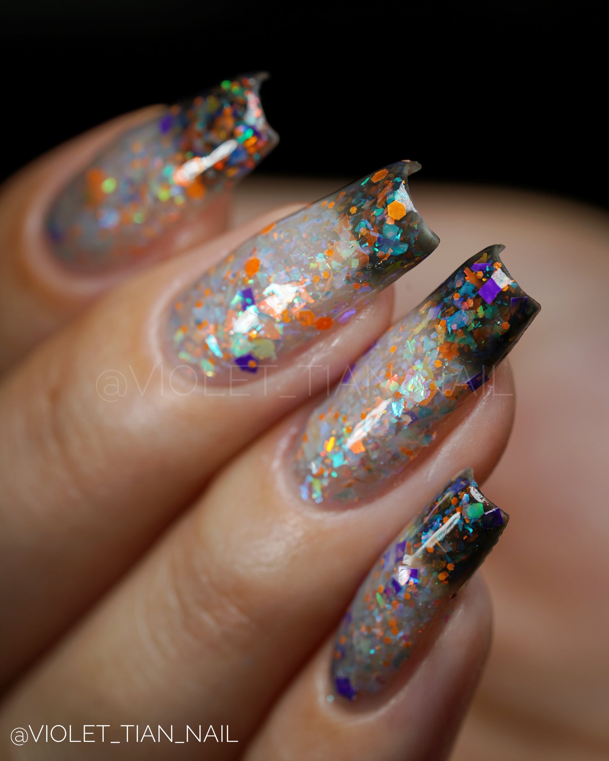 I Want to Play a Game with You 2.0 (thermal) β A transparent-to-black thermal with red-orange-gold flakes, green-blue-purple flakes, purple square glitters, and orange hex glitters.
