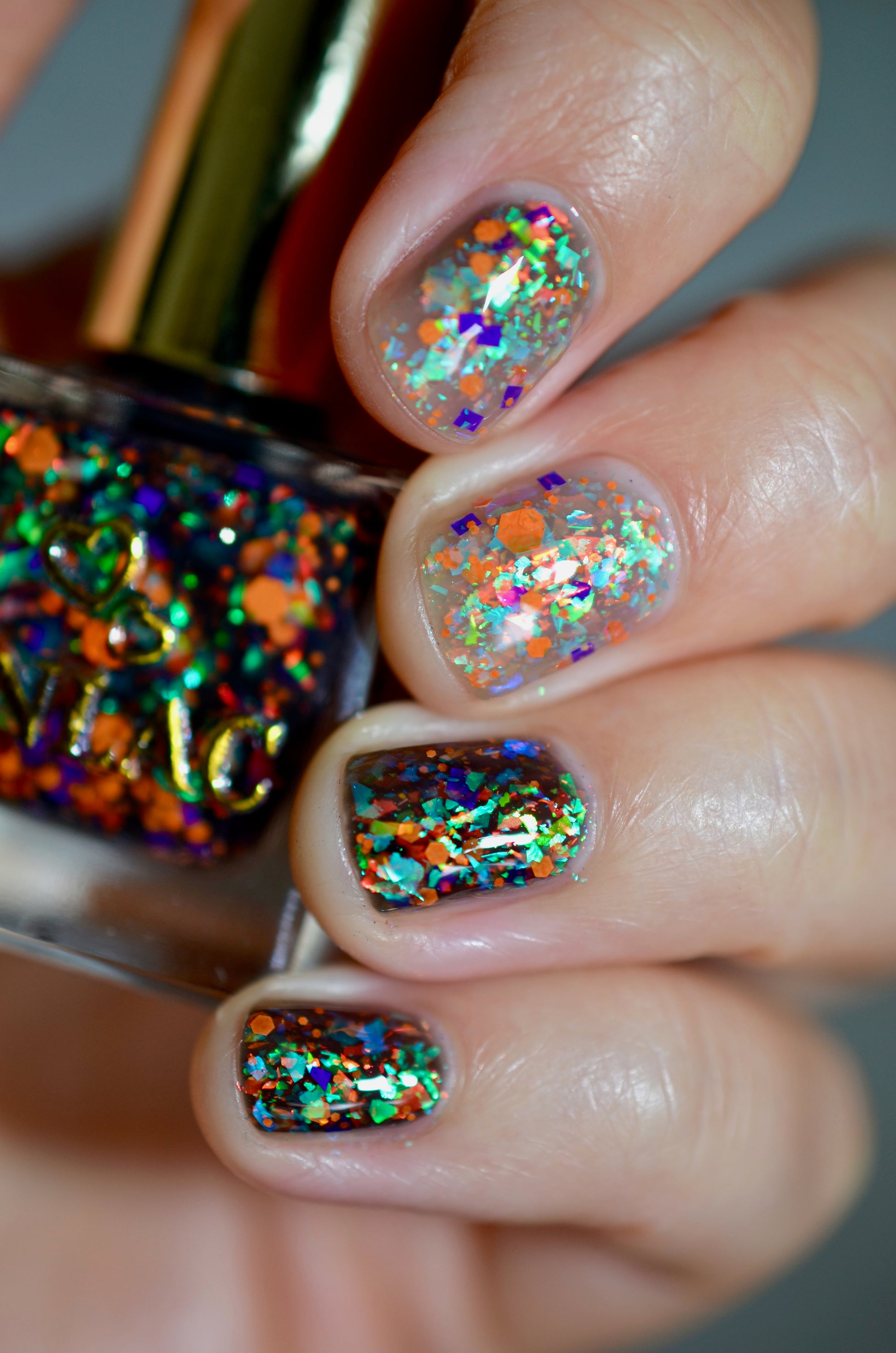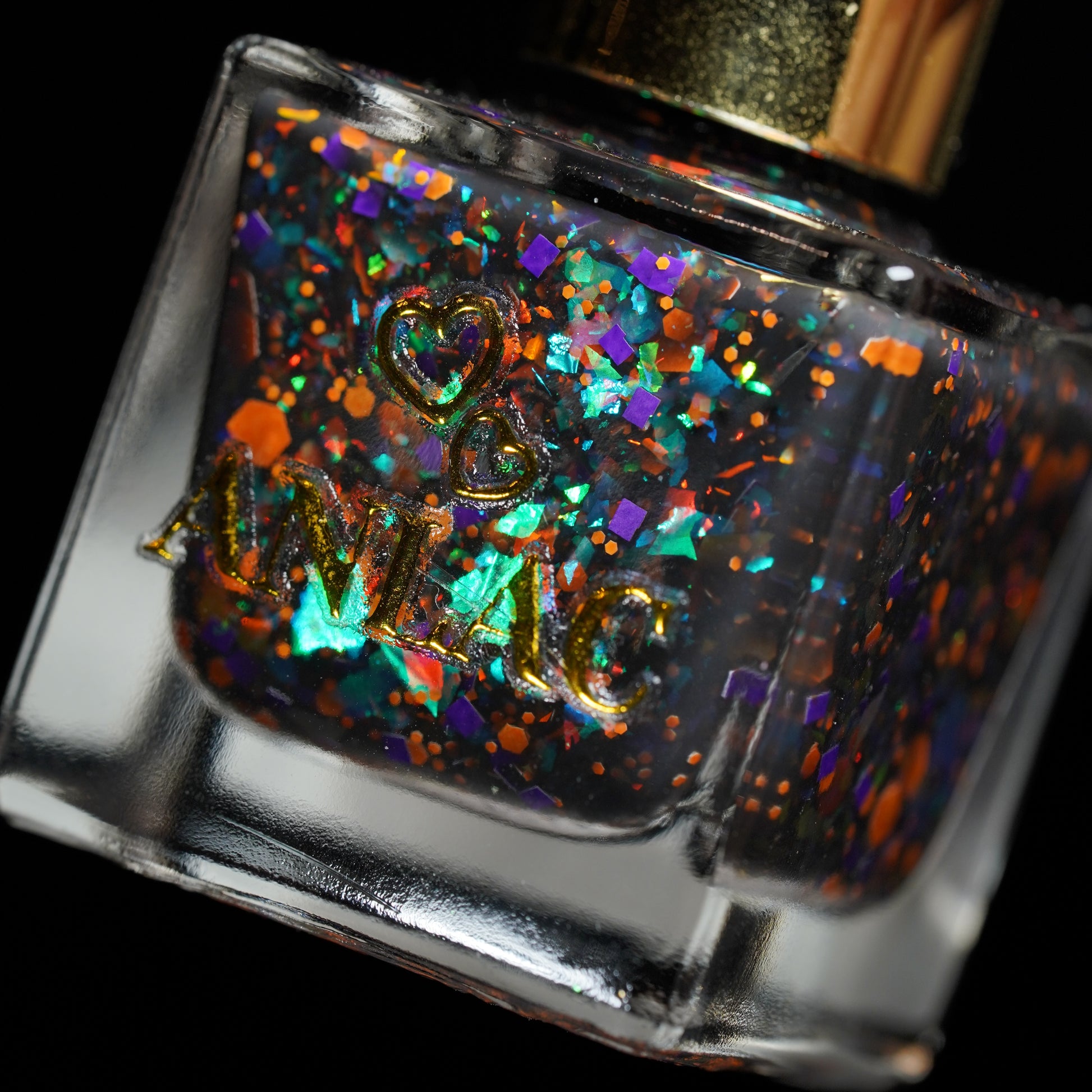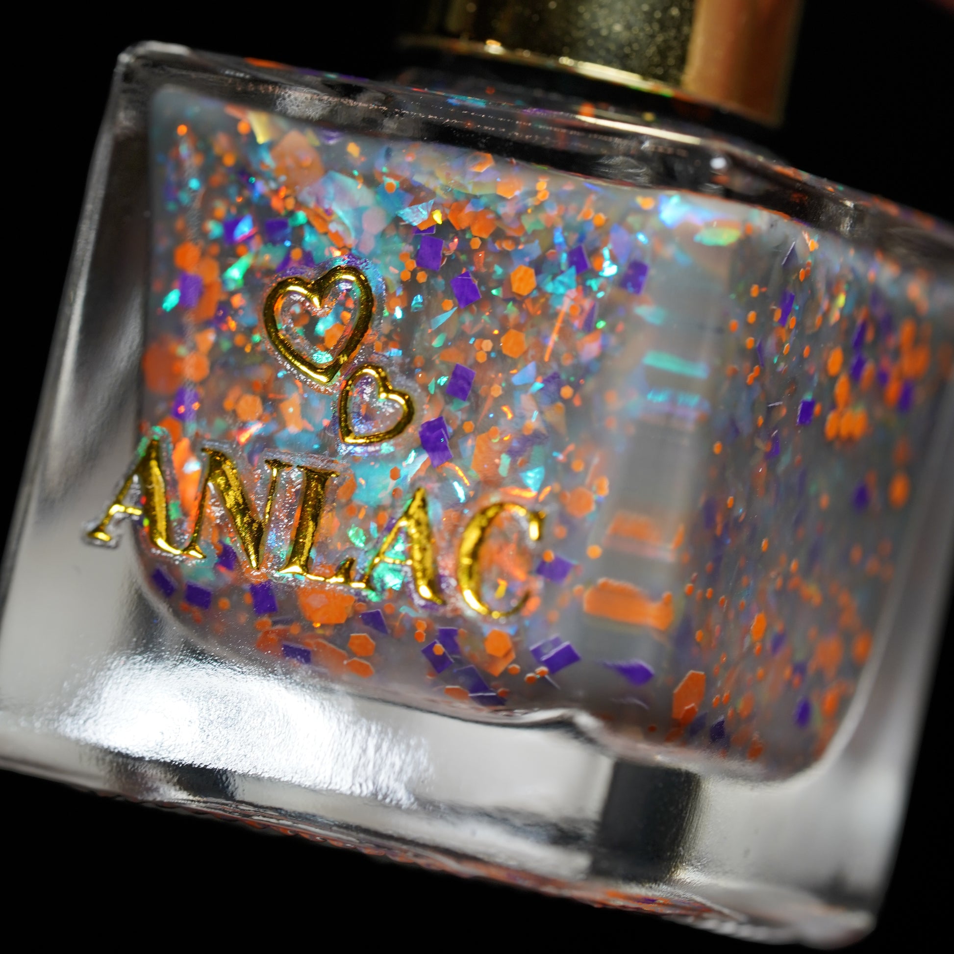 I Want to Play a Game with You 2.0 (thermal) β A transparent-to-black thermal with red-orange-gold flakes, green-blue-purple flakes, purple square glitters, and orange hex glitters.