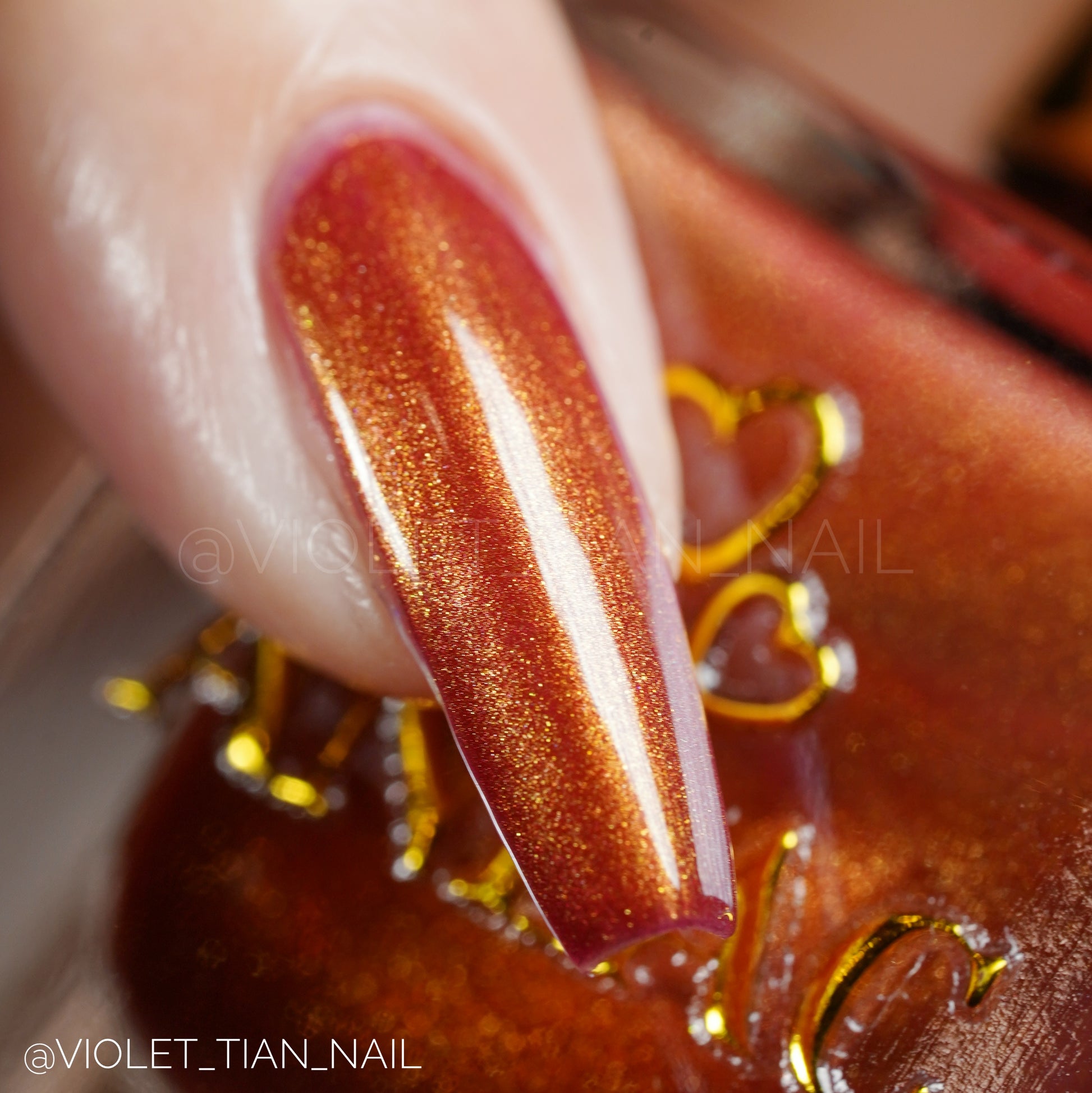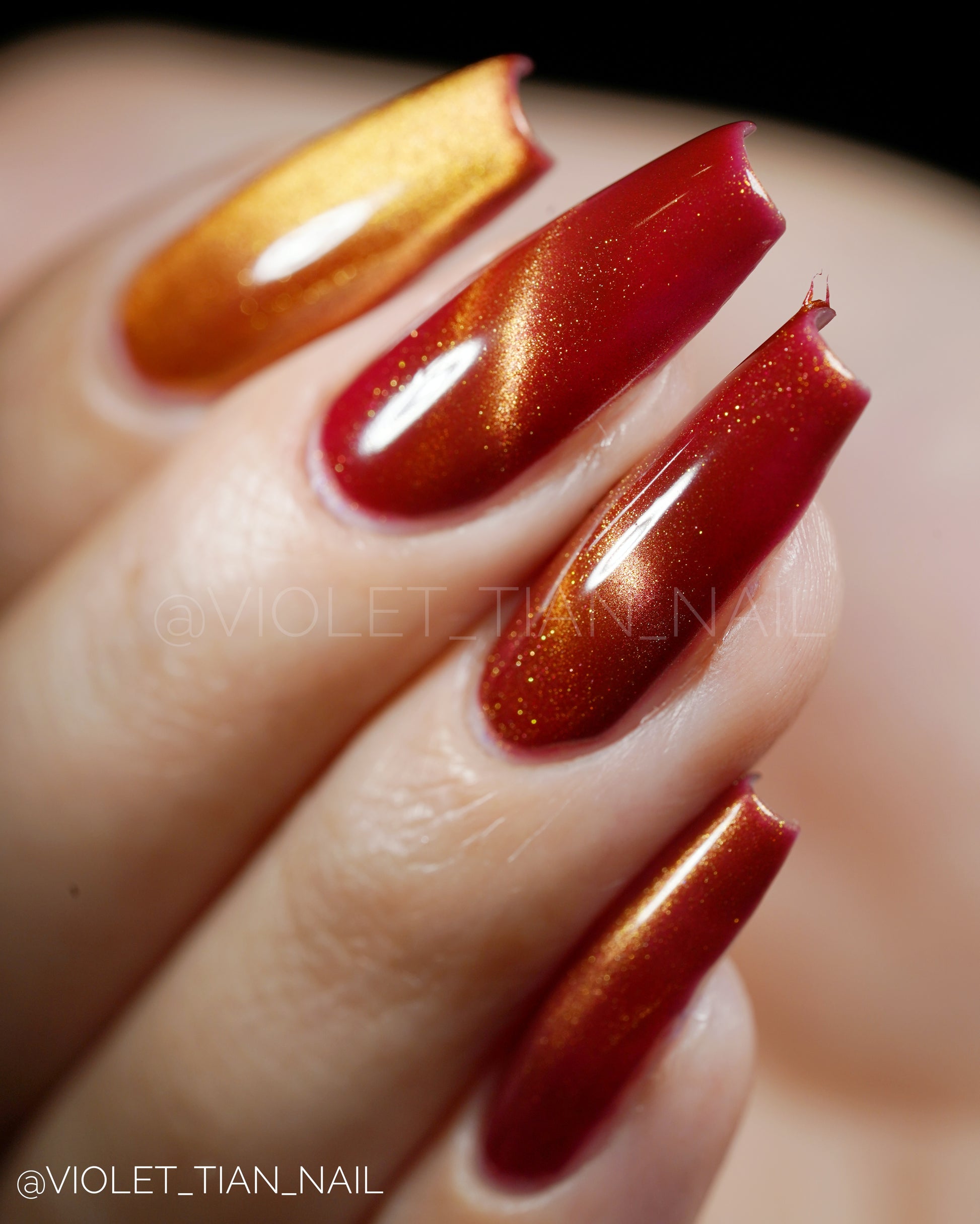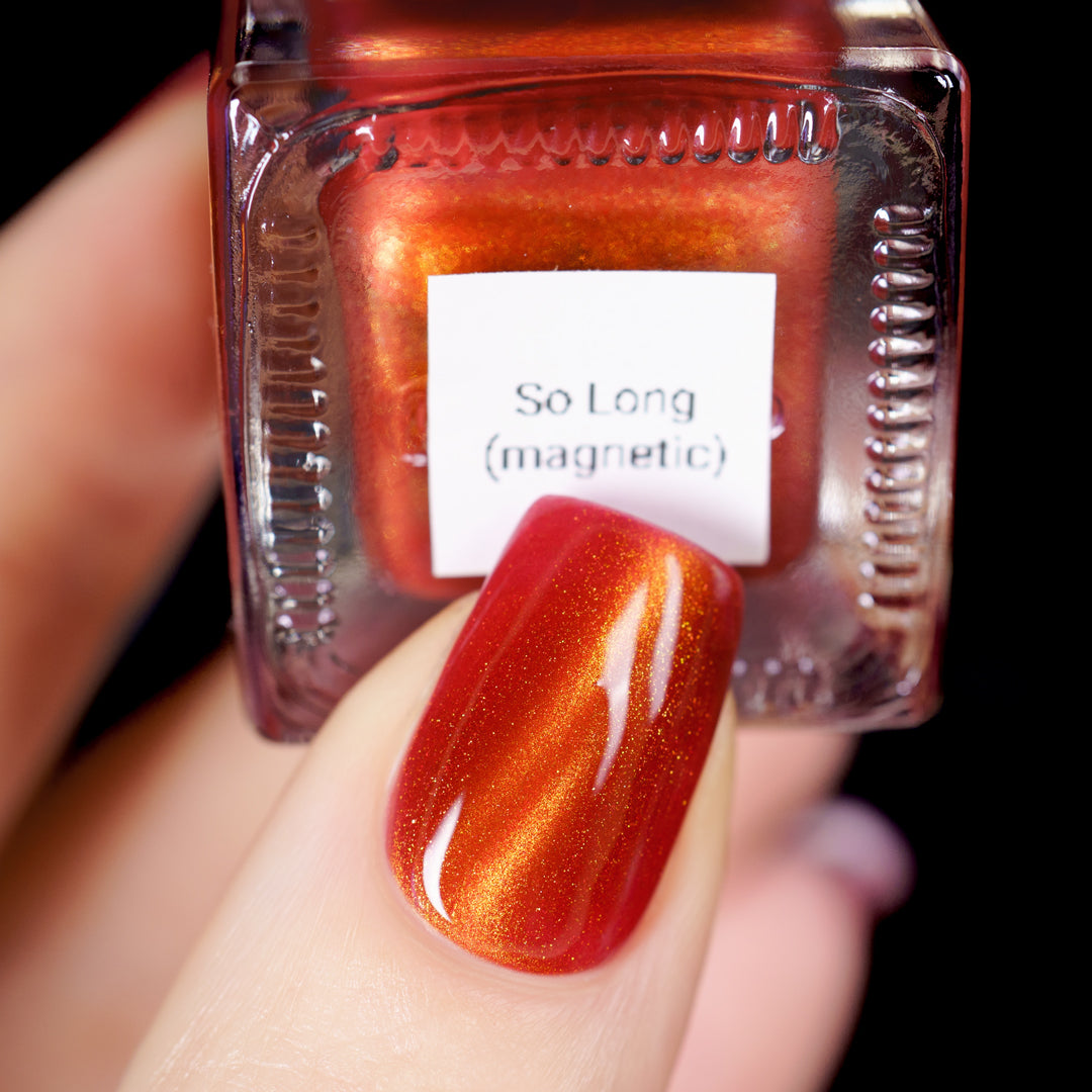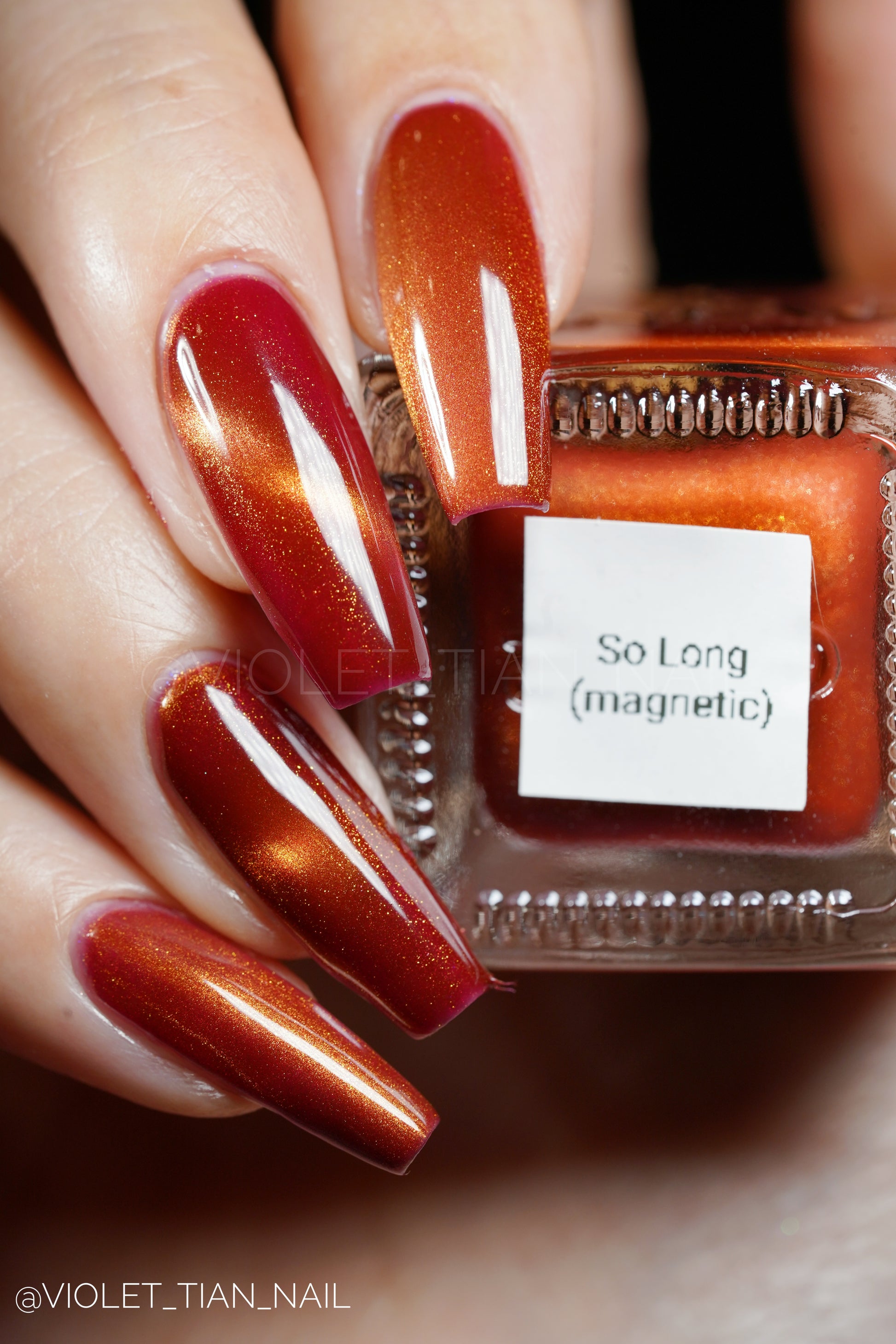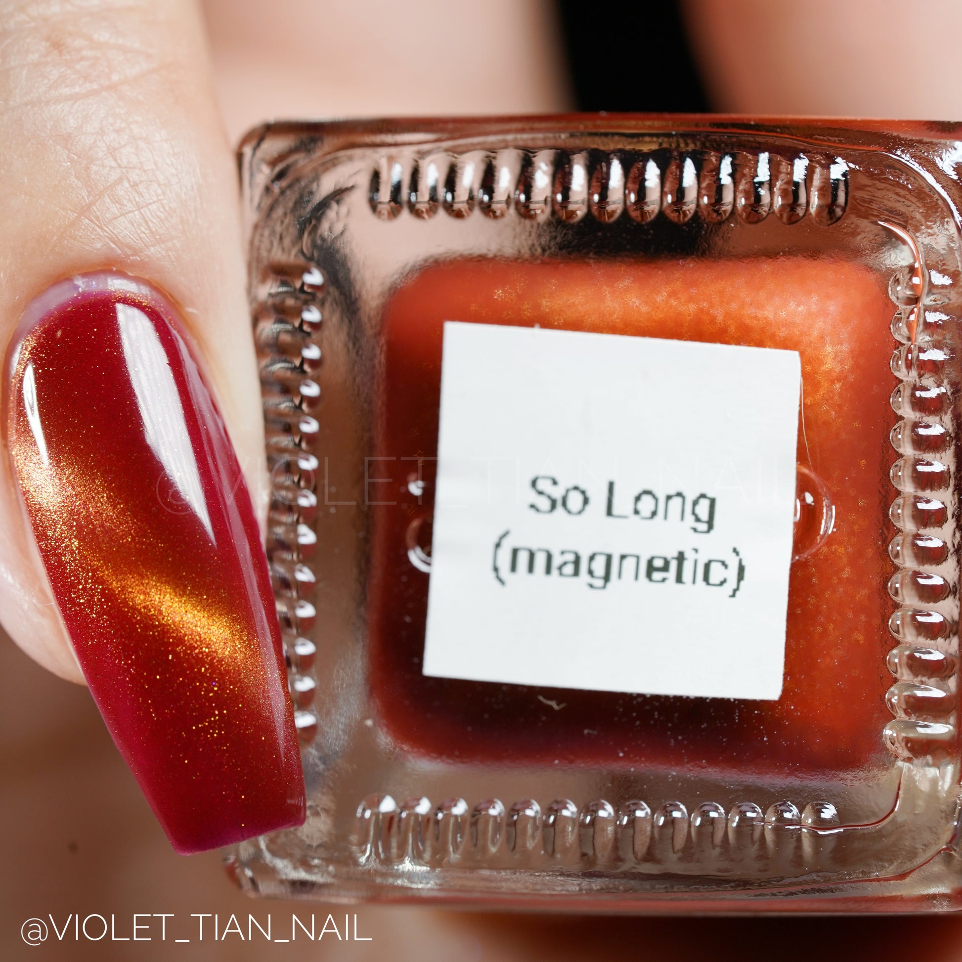 So Long(magnetic) - It’s a plum red base one with gold magnetic shimmers. There are 2 types of magnetic shimmer inside so it can create layers because of the reaction to the magnet. You’ll see it when applying on your nails.